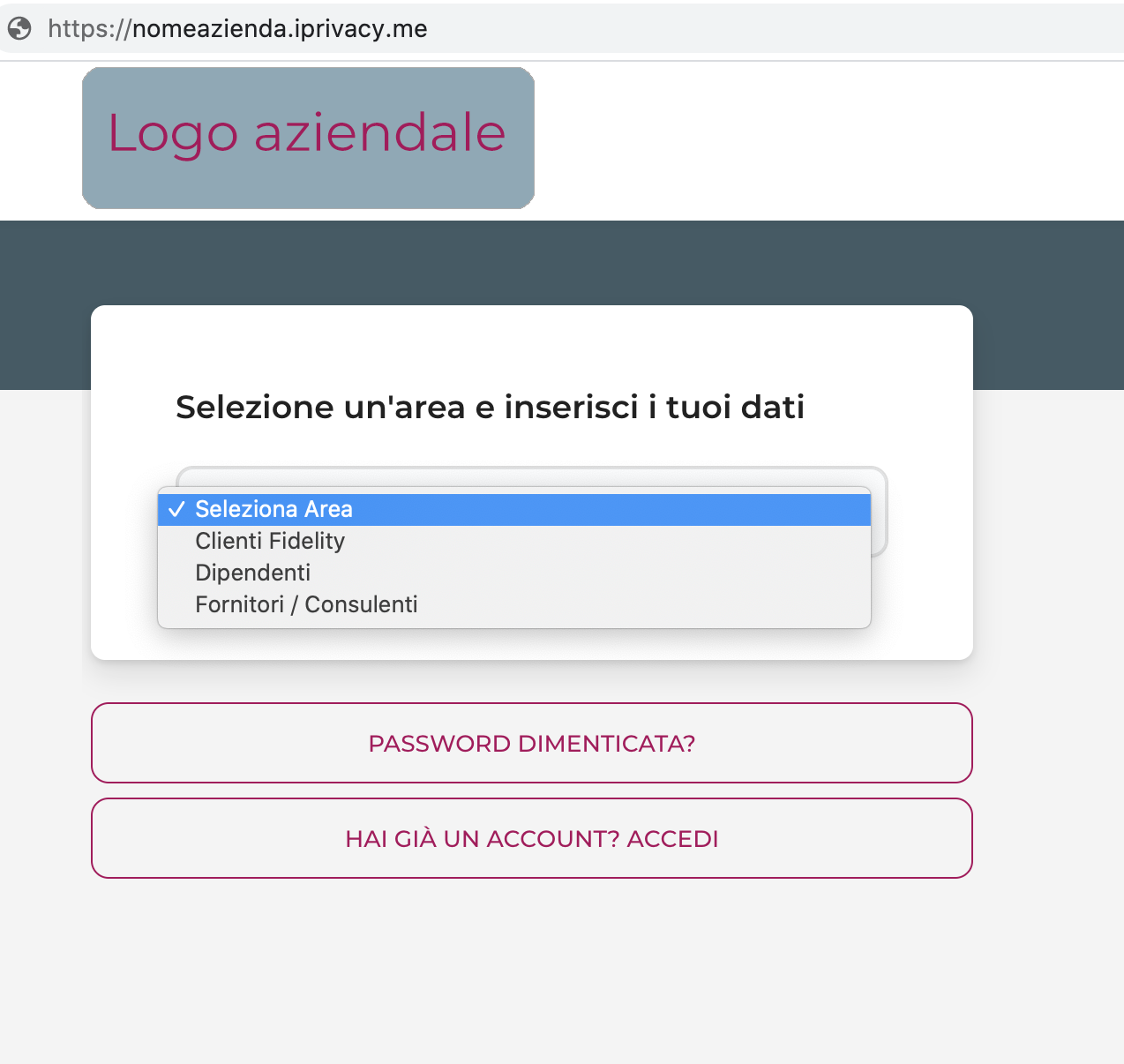 Sul link personalizzato della propria azienda ogni utente (Esempio Clienti Fidelity Card/Dipendente/Fornitori/Consulenti) può accedere alla sua area riservata